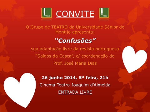 No dia 26 de Junho, quinta-feira, pelas 21h00, a peça de teatro “Confusões” sobe ao palco do Cinema Teatro Joaquim D’Almeida. Uma adaptação livre da revista portuguesa “Saídos da Casca”, feita pelos alunos da Universidade Sénior do Montijo, com a coordenação do Professor José Maria Dias. A entrada é livre.