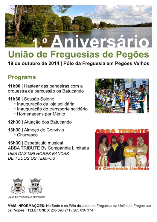 A União de Freguesias de Pegões comemora no próximo domingo, dia 19 de Outubro, o seu primeiro aniversário com um programa diversificado no pólo da freguesia em Pegões Velhos.