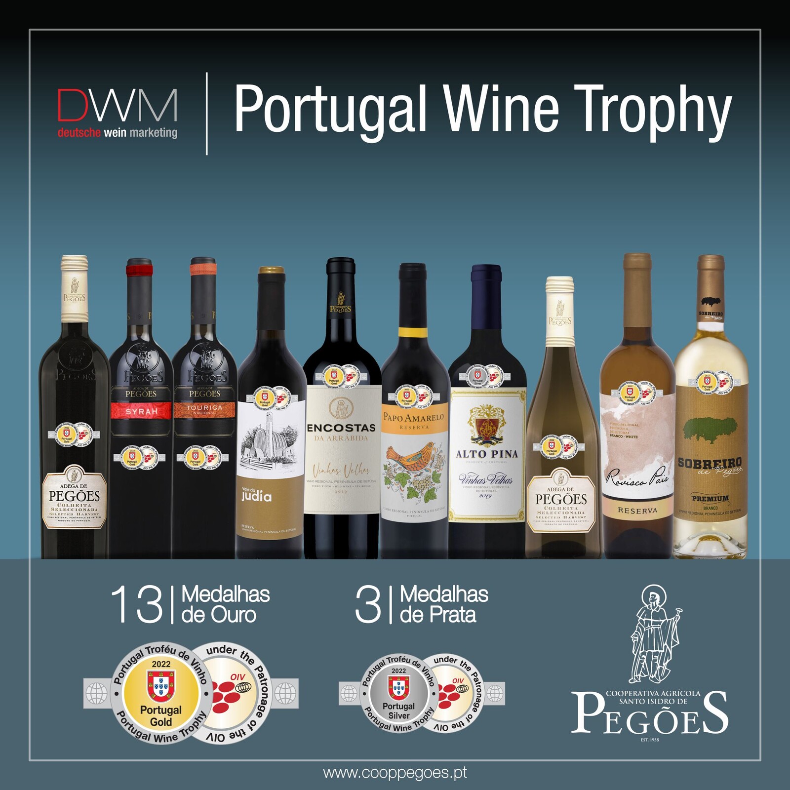 A Adega de Pegões foi distinguida com 13 medalhas de Ouro e 3 Medalhas de Prata no Portugal Wine Trophy , um dos mais importantes concursos de vinhos portugueses, realizado pela empresa alemã Deutsche Wein Marketing.