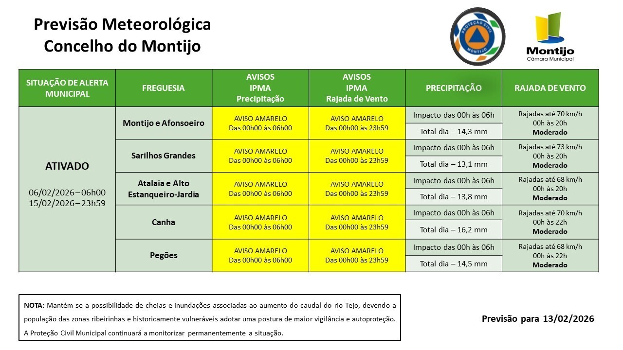 Entre as 21h00 de hoje (12/02/2026) e as 06h00 de amanhã (13/02/2016) estaremos sob aviso amarelo de precipitação, no concelho do Montijo prevê-se precipitação superior a 18 mm exatamente nesse período sendo também a fase de maior impacto.