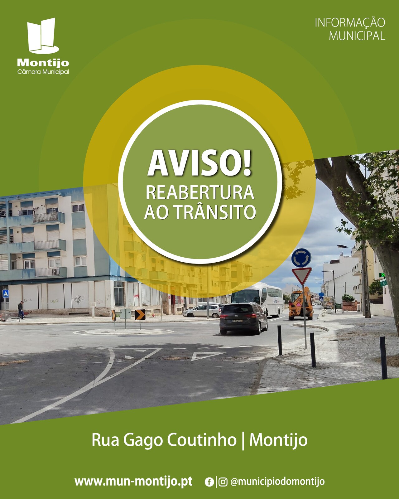 A Câmara Municipal do Montijo informa que, após intervenção na rede viária, o trânsito na Rua Gago Coutinho já se encontra reaberto.